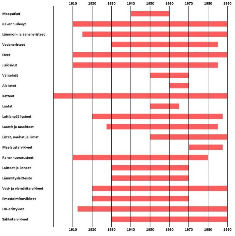 Mitä enemmän asbestille altistuu, sitä suurempi riski on sairastua. Altistuminen asbestille aiheuttaa oireilua yleensä vasta kymmenien vuosien (20-30 vuotta) kuluttua altistumisesta. Tutkimuksissa on todettu, että katon rajasta tiputettu asbestikuitu leijailee lattialle noin 48 tuntia. AsbestikartoitusEnnen rakennuksen remontin tai purkamisen aloittamista rakennuttajan on varmistuttava siitä, ettei purettavissa rakenteissa ole asbestia. Mikäli rakennus on valmistunut ennen vuotta 1994, asbestikartoitus on tehtävä. Asbestikartoituksessa selvitetään kohteessa mahdollisesti olevan asbestin sijainti, laatu, määrä ja pölyävyys käsiteltäessä tai purettaessa. Kartoituksen laatii yleensä asiantuntija ja sen perusteella laaditaan suunnitelmat asbestin poistamiseksi tai vaarattomaksi tekemiseksi. Asbesti materiaalit paikallistetaan asbestikartoituksessa.Asbestin tunnistaminen perustuu: -rakennuksen rakentamisen, korjaamisen ja kunnossapidon asiakirjoihin, joista selvitetään käytetyt materiaalit ja tarvikkeet sekä tuotenimet -tietoihin em.toimenpiteiden ajankohtana käytettyjen tarvikkeiden ja materiaalien asbestipitoisuuksista -asbestikartoittajan kohteessa tekemään tutkimukseen -materiaalista tai rakenteesta otetun näytteen laboratoriotutkimukseen AsbestipurkutyöPurkuvaiheessa kuitenkin törmätään usein kartoittamattomaan, rakenteissa piilossa olevaan asbestiin. Rakennustyömaan vastaavan työnjohdon täytyy osata varautua yllätyksiin asbestin osalta ja muuttaa tarvittaessa normaali rakennuspurku asbestityöksi.Asbestipurkutyöhön tarvitaan työsuojelupiirin lupa eli valtuutus. Asbestipurkutyötä saa tehdä ainoastaan työnantaja, jonka työsuojelutoimisto on valtuuttanut tekemään asbestipurkutyötä. Valtuutus edellyttää, että hakija on pätevä tekemään asbestipurkutyötä, hänellä on asianmukaiset laitteet ja varusteet sekä työntekijät ovat saaneet koulutuksen asbestipurkutyöhön ja heidän terveydentilansa on sopiva kyseiseen työhön. Työnantajan on toimitettava asbestipurkutyöennakkoilmoitus vähintään seitsemän vuorokautta ennen työn aloittamista työsuojelutoimistoon. Työ voidaan aloittaa aikaisemmin viranomaisen suostumuksella (vesi-vahinko saneeraukset). Asbestipurkutyö on tehtävä suunnitelman mukaisesti. Missä asbestia on käytettyAsbestin käyttö rakennusmateriaaleissa: Yleisnimellä asbesti kutsutaan kuitumaisia silikaattimineraaleja. Yleisimpiä asbestilaatuja ovat krysotiili, krokidoliitti eli sininen asbesti, amosiitti ja antofylliitti. Ehjistä asbestimateriaaleista ei ole haittaa terveydelle, mutta rikkoutuneista asbestia sisältävistä materiaaleista voi irrota asbestikuituja sisäilmaan. Rakennusmateriaaleissa asbestia alettiin käyttää 1900-alussa, ja käyttö oli laajinta 1960-70-luvun vaihteessa. Uudet suomalaiset rakennusmateriaalit eivät enää sisällä asbestia. * ruiskutetut eristeet: katot, ilmanvaihtokanavat * lämmöneristemassat: putket, kattilat, varaajat * asbestisementtituotteet: seinä- ja kattolevyt, vesi- ja viemäriputket, ilmanvaihtokanavat * lattiamateriaalit: vinyyliasbestilaatat, joustovinyylimatot, magnesiamassalattiat, asbestipahviset muovimatot * bitumituotteet: liimat, huopakatteet, vedeneristysaineet, bitumimaalit * putkieristeet, tasoitteet, julkisivumaalit, laattojen kiinnityslaastit ja asbestipahvi. Asbestin esiintyvyys suomessa![]() Lähde: Insinööritoimisto K. Parila Oy 8.8.2022 Taulukko päivitetty 13.5.2020: korjattu vuosikymmenien sijoittelua ja liimojen esiintymisvuotta. |
